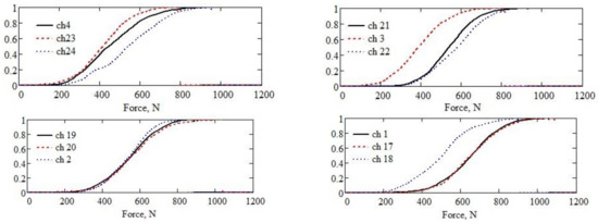 The distribution functions of the twelve random variables described by the numerical sequences in Figure 7 are calculated in the same way as the probability densities and probabilities whose graphic representations are given in Figure 8. Therefore, the distribution functions are expressed as interpolations by cubic spline functions, for which the graphic representations are given in Figure 9. The graphic representations of the twelve distribution functions of the sequences of numerical values coming from the measurement points located on the supports of the twelve working bodies are grouped three by one in the graph, corresponding to the three working bodies in each line, with the counting starting from the back of the tractor.