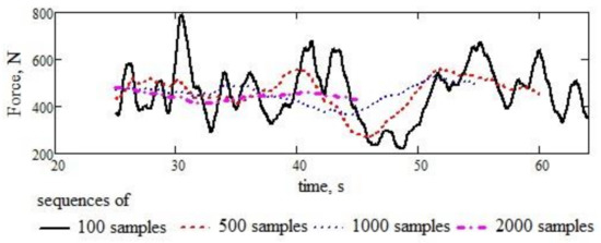 In Figure 10, we see the behaviour of the average value of the random variable given by the registration with the ch4 code (coming from the working body in the first line after the tractor, on the extreme left). The tendency to decrease the amplitude is observed with an increase in the number of samples in the sequence considered for calculating the average value. Therefore, one can only suspect asymptotic behaviour, but such behaviour cannot be stated strictly theoretically.