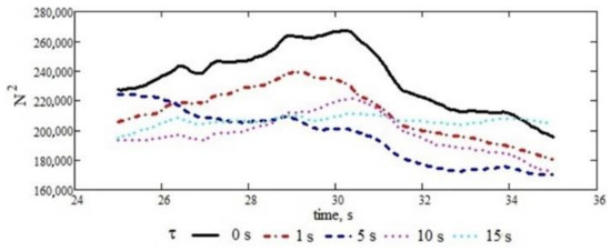 In Figure 11, the terms below the limit of the definition of the autocorrelation function are calculated for the subsequence of the ch4 signal, with the graphic representation limited to only five values of the gap. There is a tendency to decrease the amplitude of the autocorrelation function with the gap value and a weak asymptotic tendency, which does not allow us to make statements about the stationarity and/or ergodicity of the signal.