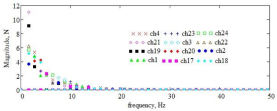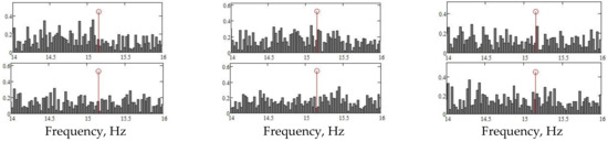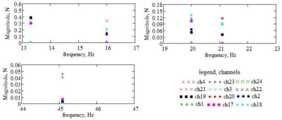In Figure 15, the spectral distribution is plotted for all signals in the range (window) 0–50 Hz, which includes the first three fundamental frequencies. Details in narrow intervals around the first three fundamental frequencies (see Figure 15) are plotted in Figure 16. It is found that, around the first three natural frequencies of the supports of the active organs, there are few frequencies from the signal spectrum, and, in addition, their magnitude is very small (when comparing the magnitudes of the frequencies in Figure 17 with those of the spectrum components in Figure 15).