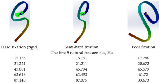 The first five natural frequencies of the supports of the working bodies of the MCLS in three variants of fixation on the load-bearing structure and the deformed forms of the structure in the vibration mode correspond to the fundamental frequency.