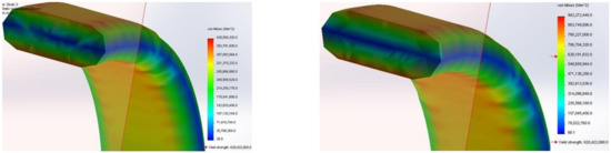The von Mises stress map on the section with the maximum load on the support of a working body of the MCLS. The load values were 518 N (left) and 1086 N (right).