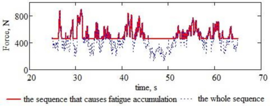Representations of the spectral frequency distributions of the twelve supports of the working bodies (Section 2.1.4, Figure 15 and Figure 16) can be found in [24] for the chassis of a harvester. The orders of magnitude and the numerical values are also comparable, being characteristic of the working processes of agricultural machines. As values, the forces resulting from the experimental study described in this article are comparable to those found for the working bodies and also for a cultivator by the authors [68]. The obtained frequency spectra are similar to those from [69]. Unfortunately, we could not get accelerometer signals from the experimenter, which was very important. Acceleration recording remains a problem to be solved for MCLS. Some of the forces’ values and the frequency spectra’s frequencies were also obtained in [41]. In the same register of concerns and spectral values, [26] estimates the effects of frequencies and vertical accelerations on several types of tractors using frequency-acceleration diagrams. Such diagrams were not accessible for this paper, so frequency-load force diagrams on the working body were used instead. However, the principle of selecting deficient or dangerous work regimes is the same. The authors [29] use the same principle of spectral selection for the vibration level on the front axle of the Valtra 800 L tractor. As an estimator of the vibration level, the authors [29] use RMS (root mean square) amplitude [70] for the experimentally recorded acceleration sequences in the version indicated by the authors [29]. The RMS maximums are recorded in the frequency range where the maximum oscillation amplitudes of our force sequences were located. The optimisation of the frame of a precision agricultural machine for sowing vegetables by avoiding resonances, based on the same principles as in this article, is described in [61]. The authors proceed similarly [36] for cultivators with working bodies very similar to those with which the MCLS cultivator was equipped in our experiments. Similarly, the authors [62] proceed with the study of the vibration of rapeseed seeds, additionally using high-speed photography and image recognition. All the frequency spectra (in this case normalised) are used in [67] to carry out experimental investigations with vertical damping for block-modular aggregates. As in this article, the authors [71] use spectral analysis and finite element analysis to predict fatigue accumulation in the arm of an excavator. The use of statistical analysis to estimate fatigue life dates back a long time [72], even for an agricultural cultivator; this is one of the main applications of the study of random vibrations. A similar approach for the testing of agricultural machines in an accelerated regime is proposed by the authors [73], in the same manner that we also proposed in Section 2.1.2. It is emphasised that not only the value of the load matters but also its frequency. The authors proceed similarly in [74,75]. A solution to reduce the force of resistance to advance for a cultivator by inducing forced vibrations is presented in [34]. Additionally, the return to some classical solutions, which had been partially abandoned, appeared after studies of random vibrations [76].