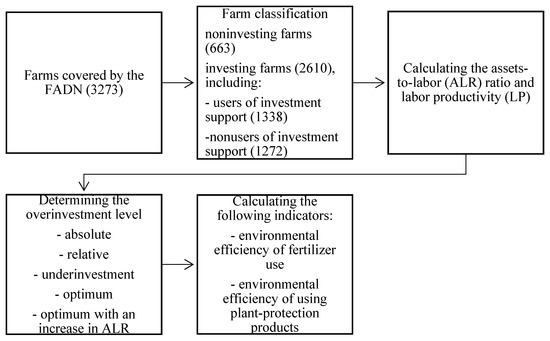 The research materials were unpublished 2010–2019 accounting data for 3273 Polish farms, retrieved from the FADN. (FADN is a farming accountancy system used in all EU member countries. It covers commercial farms which jointly account for 90% of a country’s standard output and is mostly used to monitor the effects of the Common Agricultural Policy and to develop its future assumptions) database. Farms were divided into investing farms (investing with investment support and investing without investment support) and noninvesting farms. For this purpose, those farms for which the sum of investments in 2010–2019 was less than PLN 10,000 were considered noninvesting. According to accounting records on fixed assets, depreciation is made on assets above the value of PLN 10,000. On the other hand, farms using investment support were considered those for which the sum of investment support for the surveyed 10 years was greater than PLN 0. All others were considered nonusers of investment support. The research diagram is shown in
