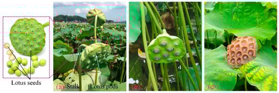 Lotus pod harvesting is an essential procedure of the lotus seed cultivation process. Limited to the aquatic or muddy growth environment and gradual ripening and random location distribution characteristics of the lotus pods, manual selective picking has been the only way to harvest lotus pods since ancient times. However, manual labor involves harsh working conditions, high labor intensity, and low efficiency. Especially, the mature period of lotus seeds is in the high-temperature season between July and September every year [5]. Many experienced workers are often required to participate in picking during this period. With the intensification of urbanization and population aging, the labor shortage for harvesting has become prominent, and the harvesting cost has subsequently increased [6,7]. Hence, automatic lotus pod-harvesting technology is urgently needed to fulfill the requirement of the lotus seeds industry.