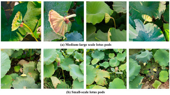 A total of 2500 images were prepared as the dataset for model training, which was then divided into a training set (2250 images) and a validation set (250 images) at a ratio of 9:1. Due to the randomness of the size and location distribution of lotus pod individuals in the growth environment, multi-scale features are reflected in the images. Therefore, a combined test set was built independently in this study to comprehensively test the segmentation performance of the deep learning instance segmentation models, wherein 380 images containing medium-large scale lotus pod objects were prepared as the medium-large scale test set (Test Set A). In addition, 320 images of mostly long-distance or small-sized lotus pods were used to make the small-scale test set (Test Set B). The ratio of the lotus pod’s mask area over the whole image area was used to discriminate the scales. The utilized thresholds between medium and large, medium and small scales were 0.125 and 0.025, respectively. Figure 3 shows some lotus pods with different scales.