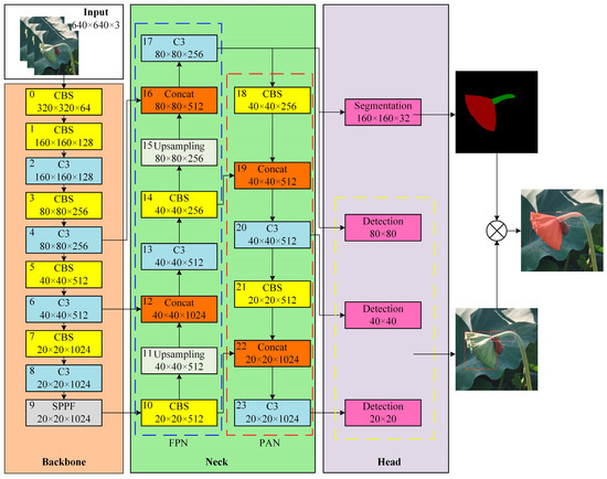 In this study, an instance segmentation model, LPSS-YOLOv5, was proposed for lotus pod and lotus stalk objects in actual planting environments. The overall network structure of the model is shown in Figure 8. Compared to the original YOLOv5 v7.0 model, two main improvements were carried out: (a) introducing the CBAM attention mechanism into the model network; and (b) adjusting the scale distribution of the multi-scale feature layer.