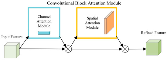 CBAM consists of two sub-modules: channel attention and spatial attention, as shown in Figure 9. For each intermediate feature map F inputted into the CBAM module, it is sequentially passed through the channel and spatial attention modules to generate a refined feature map output, where the channel attention focuses on ‘what’ the useful information is, while spatial attention focuses on ‘where’ the useful information is.