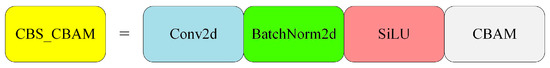 In this study, the CBAM attention mechanism was introduced into the LPSS-YOLOv5 network to enhance the model’s sensitivity and feature extraction ability for lotus pods and stalks. In the network, except for the CBS module of layer 0 in the original YOLOv5 network, all other CBS modules were replaced by CBS_CBAM modules integrated with the CBAM, as shown in Figure 8. The structure of the CBS_CBAM module is shown in Figure 10, which consists of the Conv2d module (with convolution kernel of 1 × 1, stride of 1), batch normalization (BN) layer, Sigmoid weighted linear unit activation function (SiLU), and the CBAM module.