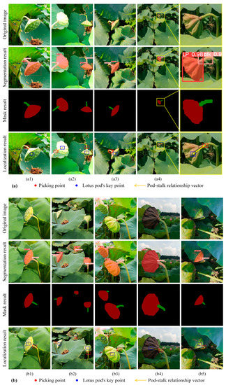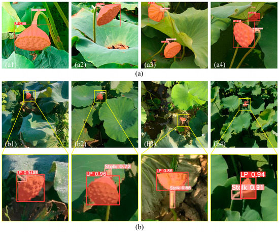 Figure 12a,b show the representative segmentation effects of LPSS-YOLOv5 on Test Sets A and B, respectively. Both medium-large scale lotus pods and stalks were effectively segmented. The generated masks fit the objects’ boundaries well. In the presence of multiple lotus pods, the model could accurately segment each object (Figure 12(a3)). In addition, the model could still achieve accurate segmentation even if the lotus pod was partially obscured by surrounding lotus leaves, as shown in Figure 12(a4).