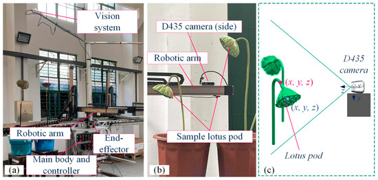 Furthermore, a 3D localization test of lotus pods and stalks in the laboratory environment was conducted based on the self-developed lotus pod harvesting robot (Figure 19a). Among them, the acquisition of 3D information was performed using a side-view depth camera (Intel Realsense D435) installed on the arm of the harvesting robot (Figure 19b). The camera uses stereoscopic depth technology with a global shutter and the ideal depth range is 0.3 m~3 m. In the test, the RGB and the depth images of the sample lotus pods were captured with the camera, and the schematic diagram is shown in Figure 19c. The pixel resolution of RGB and depth images set was 1280 × 720. After the acquisition, the depth image was aligned to the color image. Then, the method described in Section 3.4 was used to obtain the 2D localization information of the picking point and the key point of the lotus pod. Subsequently, the final 3D space coordinates of the points were obtained according to the camera’s intrinsic parameters and corresponding depth data.