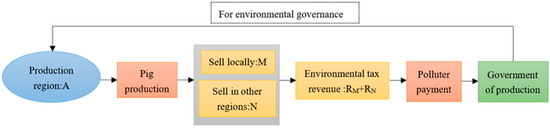 China experiences significant inter-provincial economic inequality, highlighting the need to consider not only the revenue generated from environmental taxes but also the potential impact on regional economies when implementing measures to address environmental pollution. In line with China’s environmental tax law, pig farming operations with a size exceeding 500 heads are required to pay the environmental protection tax [15]. In China, due to the imbalanced production and sales of pigs across different regions, it is common to divide major production areas and major consumption areas. In order to meet the demand for swine supply in various provinces, the major production areas not only cater to local consumption but also employ measures such as “pig redistribution” to transport pigs from major production areas to major consumption areas, thus addressing the issue of uneven distribution of pig resources. Based on the pig production layout, the current specific taxation methods are depicted in Figure 1. Figure 1 illustrates the current environmental tax mechanism. In Figure 1, Region A represents the area of pig production. Pigs produced in Region A can be divided into two components: one component is sold locally, consisting of M heads, which generates RM’ environmental tax; the other component is sold in other regions, consisting of N heads. As per the existing tax system, all emissions throughout the production chain are attributed to the province of origin. Consequently, the polluter in Region A is responsible for bearing the environmental tax of RM + RN, which is retained by Region A and utilized for environmental governance purposes in due course.