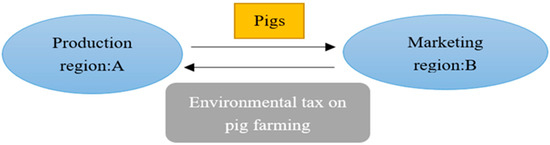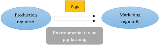 However, the tax mechanism imposed on large-scale pig farming may potentially contribute to economic inequality among the main pig producers and purchasers, while the effectiveness of pollution mitigation remains uncertain. Firstly, in 2016, China issued a guideline on pig production development; the primary pig-producing regions are concentrated in the central and western areas, with major purchasers predominantly located in eastern areas. This production distribution in pig farming leads to an unequal consumption of environmental resources among regions. Moreover, within the context of regional uneven development, imposing an environmental tax on the main producing areas tends to burden less developed provinces with excessive pollutant emissions and pollution tax payments. Meanwhile, the main pig-consuming provinces tend to be net importers of pig products at a significantly lower cost, as depicted in Figure 2. In Figure 2, Region A represents the pig production region, while Region B represents the pig consumption region. Under the current pig production layout, Region B tends to externalize pollution to Region A, thereby increasing the intensity of pollution control measures and tax burdens on Region A, ultimately constraining its development prospects.