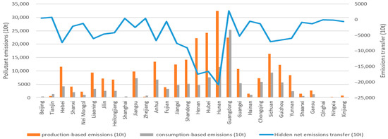 As depicted in Figure 1, using Formulas (1) to (2) and (5) to (6), this paper calculated the regional pollutant emissions from pig production and consumption separately for the year 2020. Following the approach of Xue et al. [25], we determined the net emissions transfer by subtracting the production-based emissions from the consumption-based emissions. If the result is greater than zero, it indicates the presence of hidden net pollution transfer in that region. In Figure 5, among the analyzed regions, Guangdong, Beijing, Tianjin, Shanghai, and Zhejiang remained unaffected by pollution transfer, while other regions received water pollution in amounts of 2.842 × 104 t, 4.301 × 103 t, 7.015 × 103 t, 3.813 × 103 t, and 3.748 × 103 t, respectively. The remaining 25 regions experienced varying degrees of hidden pollution net transfer. Among them, Hunan had the highest level of hidden pollution net transfer. As a major pig production province, Hunan contributed the highest production-based pollutant emissions of 3.23 × 105 t, accounting for 15.81% of the national total. Henan and Hubei followed closely, bearing 13.21% and 12.54% of the hidden net emission transfer, respectively. Therefore, it is evident that the developed coastal regions reap the greatest benefits from cross-provincial pig production and marketing, while the developing inland regions suffer from the loss of ecological benefits. This indicates that cross-provincial pig production and marketing exhibit a certain level of inequality. Consequently, the design of an environmental tax must take into account the equitable sharing of environmental governance responsibilities between the production and marketing regions.