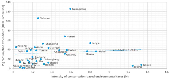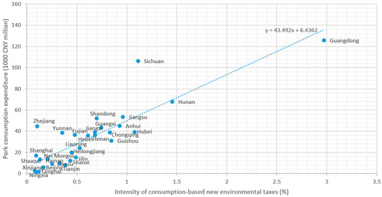 In addition, Figure 9 illustrates the linear simulation relationship between the environmental tax intensity based on consumption and pig consumption expenditure under the new tax rate. The figure clearly demonstrates a significant positive correlation between the environmental tax intensity and pig consumption expenditure, indicating that the new environmental tax mechanism effectively aligns with the pig consumption level in each region and helps balance the economic burden between pig-producing and pig-marketing areas.