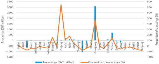 Next, we compared the new tax mechanism with the original tax mechanism and the results are presented in Figure 11. When the alternative tax mechanism under the new tax rate was used as the standard, nine regions, including Zhejiang, Shanghai, Anhui, and Guangdong, achieved tax savings. The national average tax savings rate was 37.3%. However, 70% of the regions experienced tax losses, indicating that the national environmental tax level under the original system was relatively low compared to the alternative tax system. Moreover, the proportion of regions experiencing tax savings and losses differed significantly, potentially leading to an unequal regional economic burden under a lower environmental tax intensity.