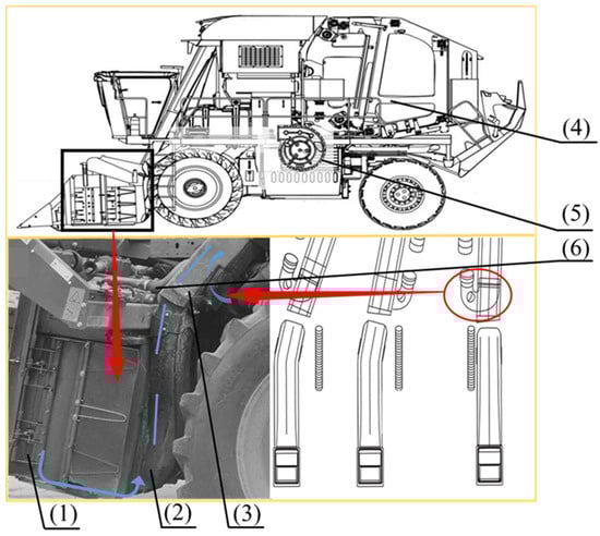 Schematic diagram of the main components and flow in the air system of a cotton picker. (1) Picking unit; (2) suction door ducts; (3) air duct; (4) cotton-collecting device; (5) centrifugal fan; (6) air duct hoses.