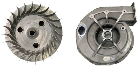 The high-pressure centrifugal fan studied in this paper is typically used in large self-propelled cotton-picking machine air systems. It mainly consists of a volute, impeller, and diffuser. The impeller is of a double-inlet type with radial blades and is separated by a middle disc. It is made of aluminum metal material and has 46 blades. The prototype fan operates at a rated speed of 4330 r/min. The structures of the prototype fan impeller and volute are shown in Figure 5, and Table 1 presents the structural parameters of the prototype impeller.