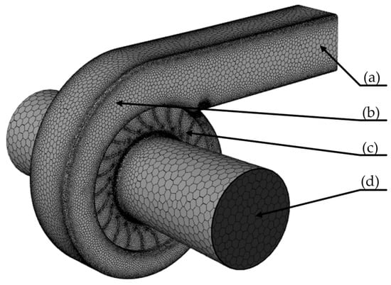 Computation domain model and grid. (a) Outlet extension domain, (b) volute domain, (c) impeller domain, and (d) inlet extension domain.