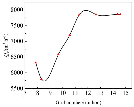 The verification of grid independence for the computational domain of the centrifugal fan was conducted using the volumetric flow rate as the validation target. The relationship between the total number of grids and the fan’s volumetric flow rate is shown in Figure 7. It can be observed that when the total number of grids reaches 14.36 million, the fan’s volumetric flow rate reaches a steady value and no longer changes significantly with an increase in the number of grids. This confirms that the solution has reached grid independence, satisfying the requirements for the grid-independent solution. To ensure accuracy and reduce computational time, the total number of grids in the fluid domain was set to 14.58 million, with 12.05 million grids in the volute and 2.53 million grids in the impeller region.