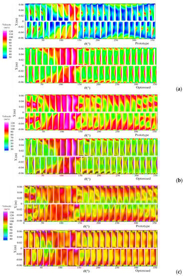 By analyzing the internal flow conditions of the two types of blades under the rated operating condition, the improving effect of the internal flow within the impeller is revealed. Figure 8a–c represent the velocity distribution on the planes of 20%, 40%, and 80% blade height sections, respectively. Figure 9 illustrates the schematic diagram of the angles during the plane unfolding process. In the 20% blade height section of the prototype blade, the overall fluid velocity is relatively low, and the velocity distribution is uneven. The velocity gradient near the tongue is significant, while near the mid-span position, the fluid velocity is lower. A momentum transfer channel is formed from the pressure side to the suction side near the mid-span of the impeller, leading to the thickening and even separation of the boundary layer on the suction side. After optimization, the blade’s aerodynamic performance is enhanced, and the overall fluid velocity in the blade passage is increased, resulting in a more uniform velocity distribution. Within a circumferential angle range of 100° to 150°, the volume of the volute flow passage is relatively small, and the flow velocity in the impeller passage is higher compared to other positions. Since both types of blades adopt the same camber line, the prototype and optimized fans exhibit similar flow field distribution patterns along the circumferential direction. Compared to the 20% blade height section, at the 40% blade height section, the flow velocity inside the impeller passage increases due to the continuous work done by the impeller on the fluid. The problem of the lower flow velocity near the middle disk of the impeller is improved. In the prototype fan, there are multiple low-speed vortices within a single impeller passage, leading to a relatively turbulent airflow distribution. In contrast, the optimized blade design results in a smaller velocity gradient inside the blade passage and a more uniform velocity field distribution compared to the prototype blade. At the 80% blade height section, the “jet-wake” phenomenon can be observed. In the prototype blade, there are still multiple low-speed regions near the middle disk of the impeller, and the presence of multiple vortices within a single impeller passage persists. However, with the optimized blade design, the uniformity of the flow field distribution inside the blade passage improves and the wake region becomes smaller, leading to a more consistent and improved flow pattern.