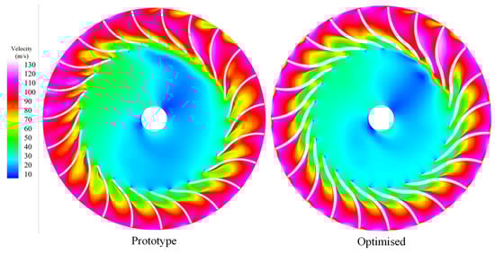 Velocity contour of the impeller.