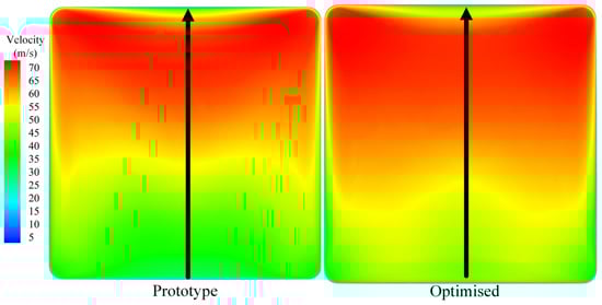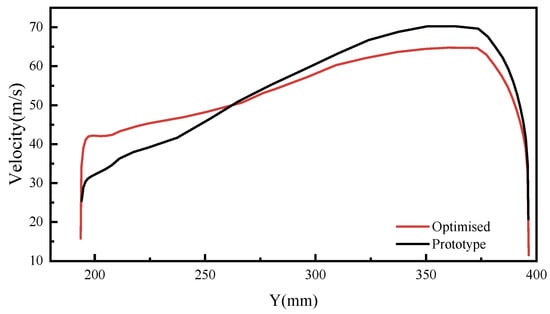 The optimized centrifugal fan’s outlet exhibits a larger high-speed region agrea and a more uniform velocity distribution. Figure 12 illustrates the velocity distribution along a straight line (position marked in Figure 11) at the outlet section of the centrifugal fan. The efficiency of the prototype centrifugal fan is 60.3%, while the optimization process increased the efficiency of the centrifugal fan to 64.8%.