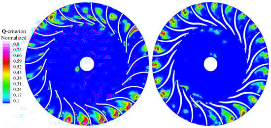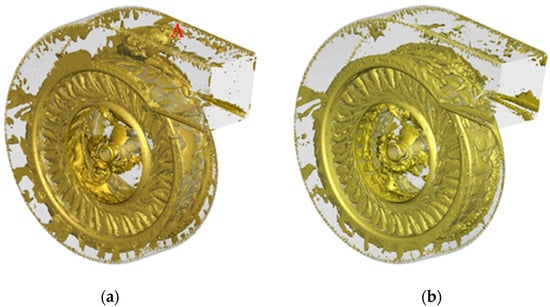 Three-dimensional vortex structure of the centrifugal fan represented by the Q-criterion. (a) Prototype; (b) optimized.