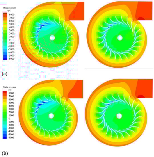 Static pressure contour of centrifugal fan. (a) Comparison of static pressure distribution for the X = 30 mm cross-section. (b) Comparison of static pressure distribution for the X = −30 mm cross-section.