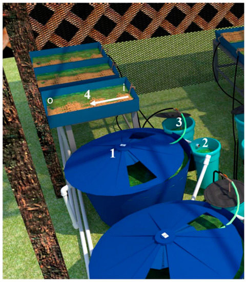 Graphical representation of the experimental unit composed of independent aquaponic systems. In (1) 1000 L individual fish tank, (2) decanter—70 L, (3) 100 L biofilter, (4) hydroponic bed—150 L. i = water inlet; o = water outlet.