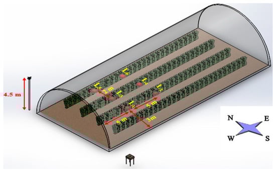 Solar radiation and the crops inside the greenhouse are two critical factors that significantly affect the energy balance of the greenhouse. The energy balance of the greenhouse is a crucial aspect of maintaining optimal growing conditions for plants and ensuring efficient energy use [4]. Solar radiation is the primary source of energy for greenhouses. The amount of solar radiation that enters the greenhouse depends on various factors, such as the orientation and design of the greenhouse, the latitude of the location, and weather conditions [5]. The solar radiation that enters the greenhouse is absorbed by the crops, soil, and other surfaces inside the greenhouse, leading to an increase in the internal temperature. The absorption of solar radiation can be affected by the transmissivity of the greenhouse cover material, the shading provided by the crops, and the orientation of the greenhouse [6].