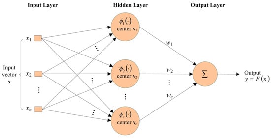 RBF models are advantageous for predicting indoor air temperature in greenhouses because they can capture the nonlinear relationships that exist between input variables and the output temperature. For example, the relationship between temperature and humidity is nonlinear, and RBF models can accurately capture this relationship, which is essential for predicting indoor air temperature in greenhouses. The RBF method is a type of neural network in which each neuron in the hidden layer utilizes a nonlinear activation function. The bias factor is employed to converge the RBF neural network during the training phase and reach the global minimum. The output of the RBF neural network for each input (x) is calculated as per previous research [22]: