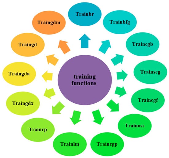 Training a neural network is a crucial step in achieving significant error in the RBF model. One of the most widely used methods for this purpose is the error back-propagation algorithm, as demonstrated in previous research [20]. In this study, thirteen training functions were employed to train the RBF model using back-propagation training algorithms, as illustrated in Figure 3. These functions were utilized to optimize the weights in the RBF model and improve the accuracy of greenhouse temperature prediction. By utilizing multiple training functions, the study aimed to identify the most effective method for training the RBF model and contribute to improved greenhouse management practices.