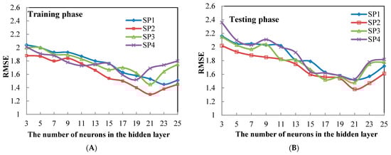 The spread parameter and number of neurons in the hidden layer are crucial factors in the RBF model that must be optimally adjusted for accurate prediction [28]. Given the importance of these two parameters, this study selected the optimal network structure in the RBF model by altering the two parameters and examining their impact on prediction error in two training and testing phases. So, the spread parameter was changed from 0.4 to 0.7 (SP1 = 0.4, SP2 = 0.5, SP3 = 0.6, and SP4 = 0.7) and the number of neurons increased from 3 to 25 to determine the optimal network structure. Then, the effect of changing the two parameters on the forecast error was evaluated, as shown in Figure 6. The results revealed that the least error was obtained for predicting greenhouse temperature in both the training and testing phases when the spread parameter was set to 0.5 and the number of neurons was 21 (RMSE value of 1.3 °C for training and 1.38 °C for testing phases). As a result, the optimal network structure in the RBF model for predicting greenhouse temperatures was determined to be 3-21-1.