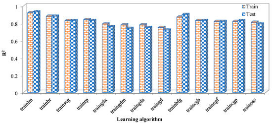 The spread parameter and number of neurons in the hidden layer are two important factors in the RBF model that must be optimally adjusted for optimal prediction [28]. Given the importance of these two factors, this study selected the optimum network structure in the RBF model by changing the two parameters and their effect on the prediction error in two training and testing phases. For selecting the optimal network structure, the spread parameter was changed from 0.4 to 0.7 (SP1 = 0.4, SP2 = 0.5, SP3 = 0.6, and SP4 = 0.7), and the number of neurons increased from 3 to 25. Then, the effect of changing the two parameters on the forecast error was investigated (Figure 5). As it can be seen, with the spread parameter equal to 0.5 and 21 neurons in the hidden layer, the least error was obtained for the prediction of greenhouse temperature in both the training and testing phases (RMSE values equal to 1.3 °C for training and 1.38 °C for testing phases). Thus, the most optimal network structure in the RBF model for the prediction of greenhouse temperature was selected as 3-21-1. In this study, 13 different algorithms were employed to train the network and adjust weights until achieving an acceptable error, as depicted in Figure 6. Among the 13 learning algorithms used for the RBF model, the LM (Levenberg-Marquardt) algorithm demonstrated superior performance for temperature modeling, with a coefficient of determination (R2) value of approximately 0.93. Similarly, in a related study by Taki et al. [21], various training algorithms were utilized to train the RBF model for predicting air, plant, and soil temperatures, with the Trainbr algorithm yielding the lowest MAPE.