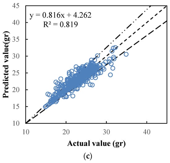 Comparison between the desired and predicted values by the MLR (a), RBF (b), and SVM (c) models.
