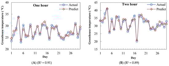 where n is the number of observational data, is the temperature value predicted by the models used for the prediction, is the temperature value measured in the greenhouse, and and are the average values of the whole desired and predicted temperatures (Taki et al., 2016b). In this study, when the MAPE and RMSE are minimum and R2 is maximum, the model gives the highest accuracy.