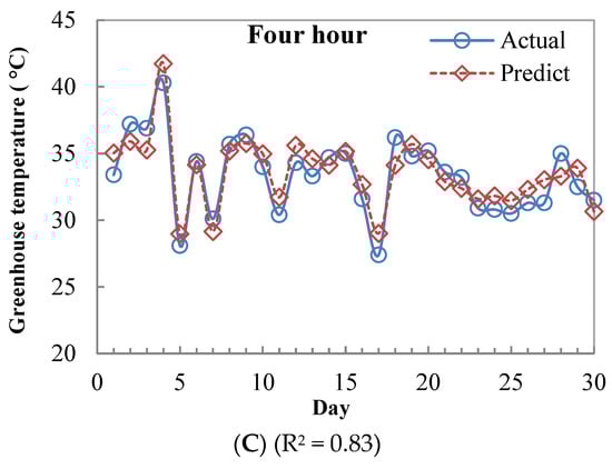 The results of the RBF model to predict the greenhouse temperature in the next hour (A), next two hours (B), and next four hours (C).