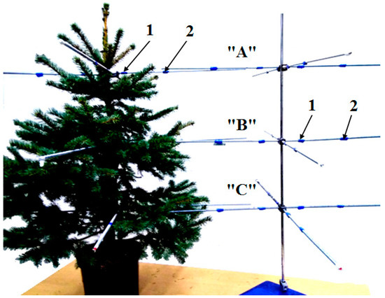 In order to evaluate the deposition of sprayed liquid in trees, samplers are used. These can be attached to branches or indirectly positioned on metal stands, artificial trees, or nets that simulate canopy space [5,39,47]. A tripod with samplers attached to its arms was employed to assess liquid deposition in this research. The stand consisted of a vertical metal rod connected to three sets of horizontally placed metal rods at three different heights. Each set comprised four rods intersecting at right angles. The vertical rod was attached to the tree trunk. The levels of sampler bars were marked with the letters “A”, “B”, and “C” from the top. In addition, in order to be able to assess the influence of the crown of the tree on the changes in the velocity of the airflow inside the spruce, a second tripod, identical to the tripod placed in the crown of the tree, was constructed to take airstream measurements without the tree. Figure 2 illustrates the tree with the tripod mounted and the tripod itself.