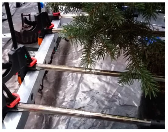 For measuring liquid deposition inside of the tree crown, plastic labels (0.02 m × 0.04 m) were used as samplers. They were glued to holders attached at the marked positions on the horizontal bars of the tripod. Each rod at every level had two types of samplers: “trunk” samplers placed 0.06 m from the trunk’s centre and “branch” samplers positioned at a distance of 0.21 m, also measured from the trunk’s centre. As there were four rods at each tripod level, so there were a total of four “trunk” samplers and four “branch” samplers (Figure 2). The “trunk” samplers were used to estimate of the amount of liquid penetrating the branches in the central part of the tree canopy near the trunk. The “branch” samplers assessed the liquid reaching the branches at a distance of approximately two-thirds of the average branch length, counting from the trunk’s centre (the vertical zone of the tree, away from the trunk).