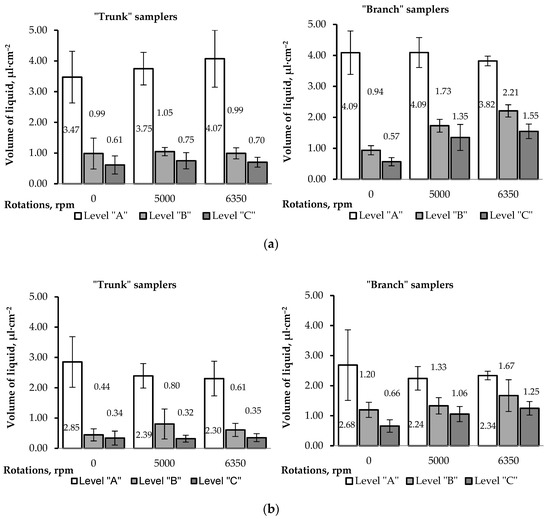 After each tree spraying, the samplers, after drying, were disconnected from the tripod rods and subjected to further processing to assess the capacity of the deposited liquid. The average results and their corresponding standard deviations are presented in Figure 4. Separate graphs were created for the liquid deposited on the “trunk” samplers and the liquid deposited on the “branch” samplers, taking into account the varying spin rates of the propellers. Figure 4a shows the results of liquid deposition on the tripod levels obtained at the speed of 0.57 m·s–1, and Figure 4b at the speed of 0.94 m·s–1.