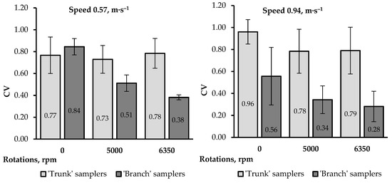 The coefficient of uniformity for liquid deposition at tree levels was calculated using Formula (2), separately for the “trunk” samplers and the “branch” samplers, considering the speed of drone propellers’ spin set to “zero” and the rotations resulting from two different weights of the multi-rotor drone. CV values were determined separately for the displacement speed of 0.57 m·s–1 and 0.94 m·s–1. The results are presented in Figure 5.