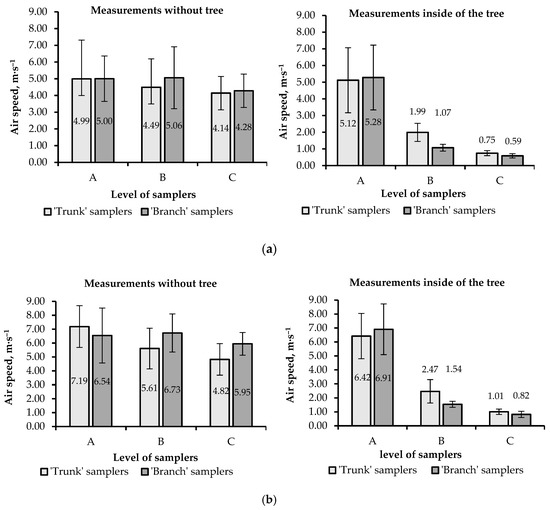 The results of the velocities of the airstream measurements are presented in Figure 6a,b. Because the velocity of the airstream was measured separately on the positions of the “trunk” samplers and separately at the “branch” samplers at levels “A”, “B”, and “C,” the charts of passing it through the tree crown and without tree were shown side by side.