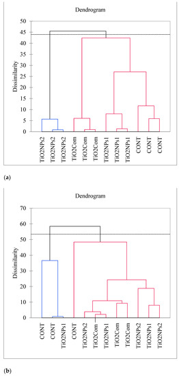 Regarding the AHC analysis of plants, the results showed well-grouped samples, with three samples forming an individual clade in each treatment. In contrast, silage AHC results were less ordered across treatments and revealed one TiO2NPs1 sample was similar to a control (Figure 1).