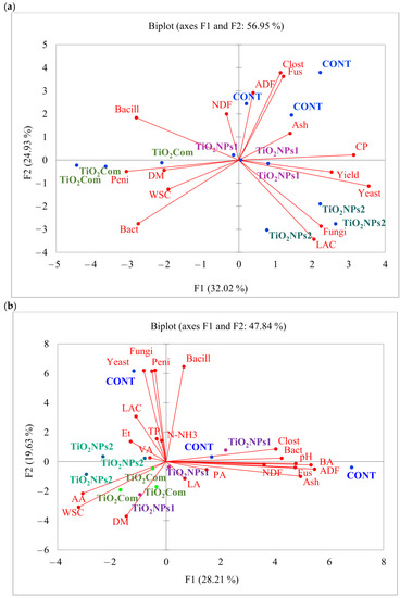 Silages treated with TiO2Com and TiO2NPs2 had high WSC content and the most desirable pH. The microbiological parameters of silage were partially different than those of herbage. All silages treated with TiO2NPs2 were characterized by a minor decrease in total bacterial counts and Bacillus spp. counts, and almost complete elimination of fungi, yeasts, Penicillium spp. and Fusarium spp. TiO2Com led to a minor decrease in the counts of Lactobacillus spp.; however, this had no influence on LA content. In one sample, TiO2NPs1 did not inhibit the growth of Clostridium spp., which was correlated with increased BA concentration, observed also in the control treatment (Figure 3).