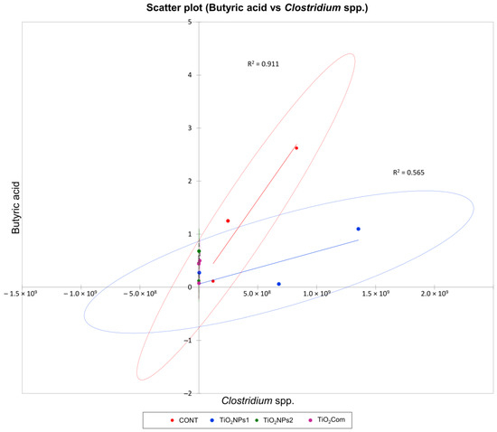 The correlation between BA content and the Clostridium spp. load was very strong (R2 > 0.9) in the CONT group and moderate (R2 = 0.57) in the TiO2NPs1 group. Due to the low Clostridium spp. load and BA concentration, below 1 mg g−1, correlations were not found in the remaining treatments (Figure 3).