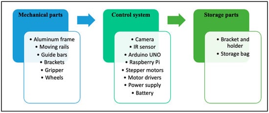 The experimental JFAPS components were constructed of three main parts, as illustrated in Figure 2. The first part is the mechanical parts including aluminum frame, moving rails, guide bars, brackets, gripper, and wheels. The second part is the control system containing camera, IR sensor, Arduino UNO, Raspberry Pi, stepper motors, motor drivers, power supply, and battery. In addition, the third part is the storage parts which include bracket and holder and storage bag. The 3D design of JFAPS drawn with Autodesk Inventor 2017 is shown in Figure 3.