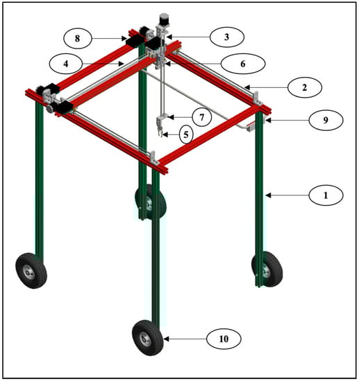 Three-dimensional design of JFAPS (1: aluminum frame; 2, 3, and 4: moving rails; 5: gripper; 6: camera; 7: IR sensor; 8: microstep driver; 9: storage unit; and 10: wheels).