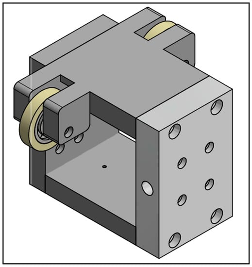 The “C” bracket, as shown in Figure 5, was mounted on the Y-axis rail for balance between Y-axis and Z-axis (vertical axis) for easy movement. The “C” bracket made of aluminum contains 3 parts: (a) bracket base with dimensions of 130 × 86 × 17.5 mm, with a bearing no. (SKF6002, SKF, Gothenburg, Sweden) fitted with nylon wheel ring on the outer face, (b) side plate for connecting the screw-bearing subassembly of the Y-axis, and (c) screw side plate for fixing the screw-bearing subassembly of the Z-axis.