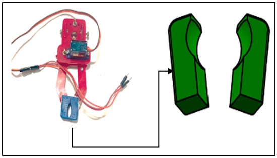 In this study, the gripper shown in Figure 6 has an overall size of 220 × 30 × 140 mm and was attached to the Z-axis end. A holder is added to the gripper; this holder helps in flower picking (especially closed flowers depending on the purpose used). The holder is designed to be 23 mm in diameter based on the average diameter of fully developed unopened flower buds, which are 20 mm in diameter. In addition, according to the flower’s mechanical and physical properties, this holder was made using a 3D printer from soft material that does not cause any physical damage or color change in the flower’s petals during the picking process. After flower detection, the flowers were transferred to the storage part using a suitable holding force ranging between 1.2 and 2.4 N (Table 1 and Table 2) using 1SF-1DF SERIES DIGITAL FORCE GAGE (Cutwel Ltd., Cleckheaton, UK) without affecting the flower quality.